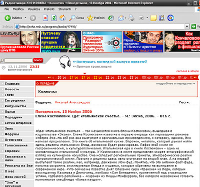 «Еда: Итальянское счастье» -- так называется книга Елены Костюкович, вышедшая в издательстве «Эксмо». Елена Костюкович известна в первую очередь как переводчик романов Умберто Эко. На сей раз она выступает с оригинальным произведением, к которому, однако, Эко написал предисловие. Это книга об итальянской кухне. Впрочем, читатель, который думает найти здесь рецепты итальянских блюд, возможно будет разочарован. Пафос этой книги не гастрономический, а культурологический. Итальянская еда в книге Костюкович – одна из составляющих итальянской культуры. У Костюкович в книге представлен скорее этнографический взгляд на кулинарное искусство. Она исследует региональные приметы, этнографические реалии гастрономической жизни. Поэтому и рецепты здесь явно отступают на второй план. А на первый выступают такие реалии, как, например, движение slow-фуд. Понятно, что это антоним фаст-фуда, попытка сохранить эксклюзивные блюда и кушанья, которые обречены на вымирание в современном мире. «Что сейчас на повестке дня? Спасение сыра «Граноне» из Лоди, которым восхищались Казанова и Дюма-отец, колбасы «Сан Бенедетто», пропеченной под угасающими углями, горбатого репейника – «карона» из Ниццы Монферрато, без которого невозможно готовить пьемонтское спецблюдо «банья каудо»».
