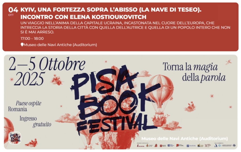 On 4 October 2025, at 17:00, Elena Kostioukovitch presented her book "Kyiv. A Fortress Over the Abyss" in Pisa.